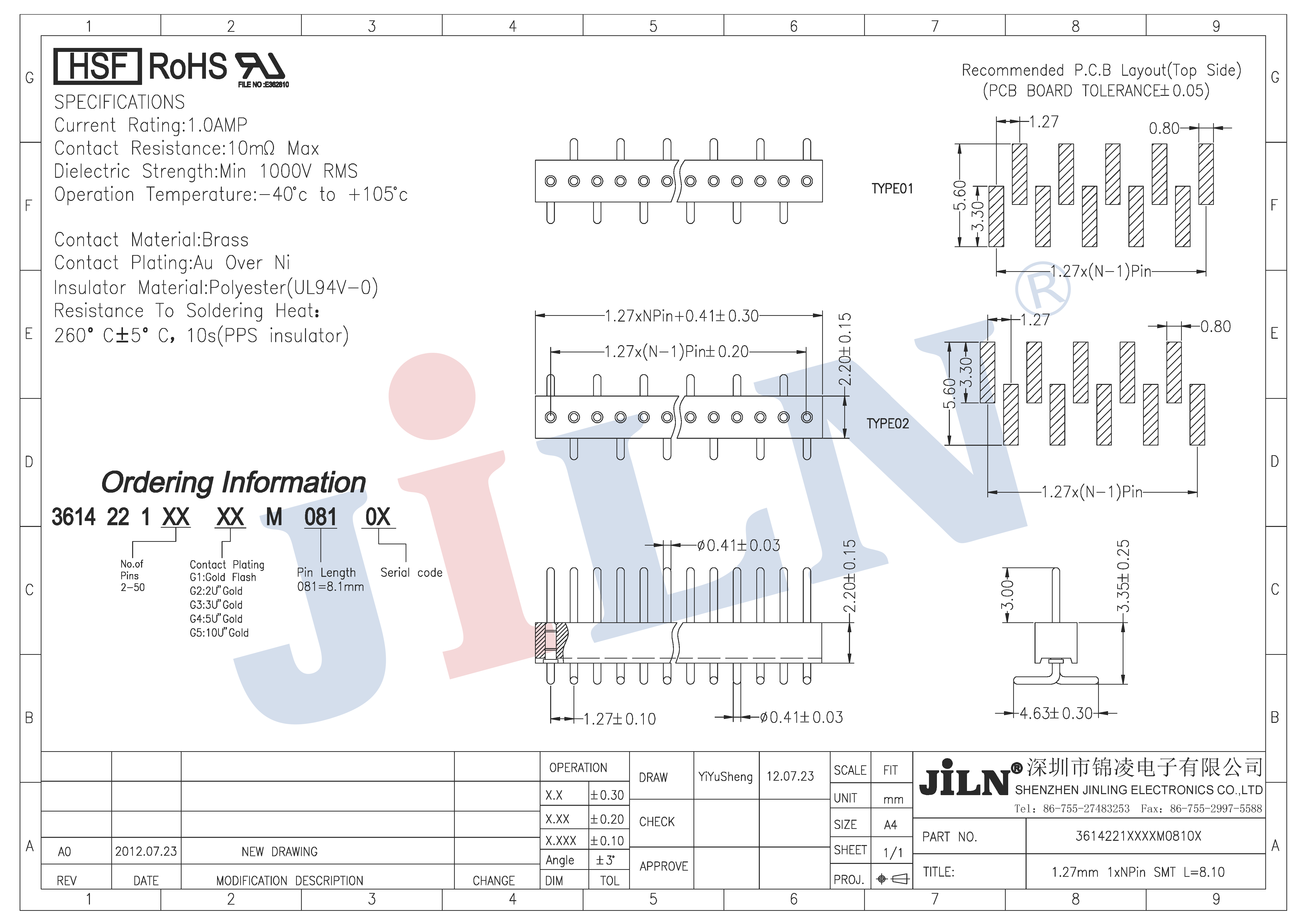 1.27mm圆孔双头针/H2.2/单排SMT/L8.1