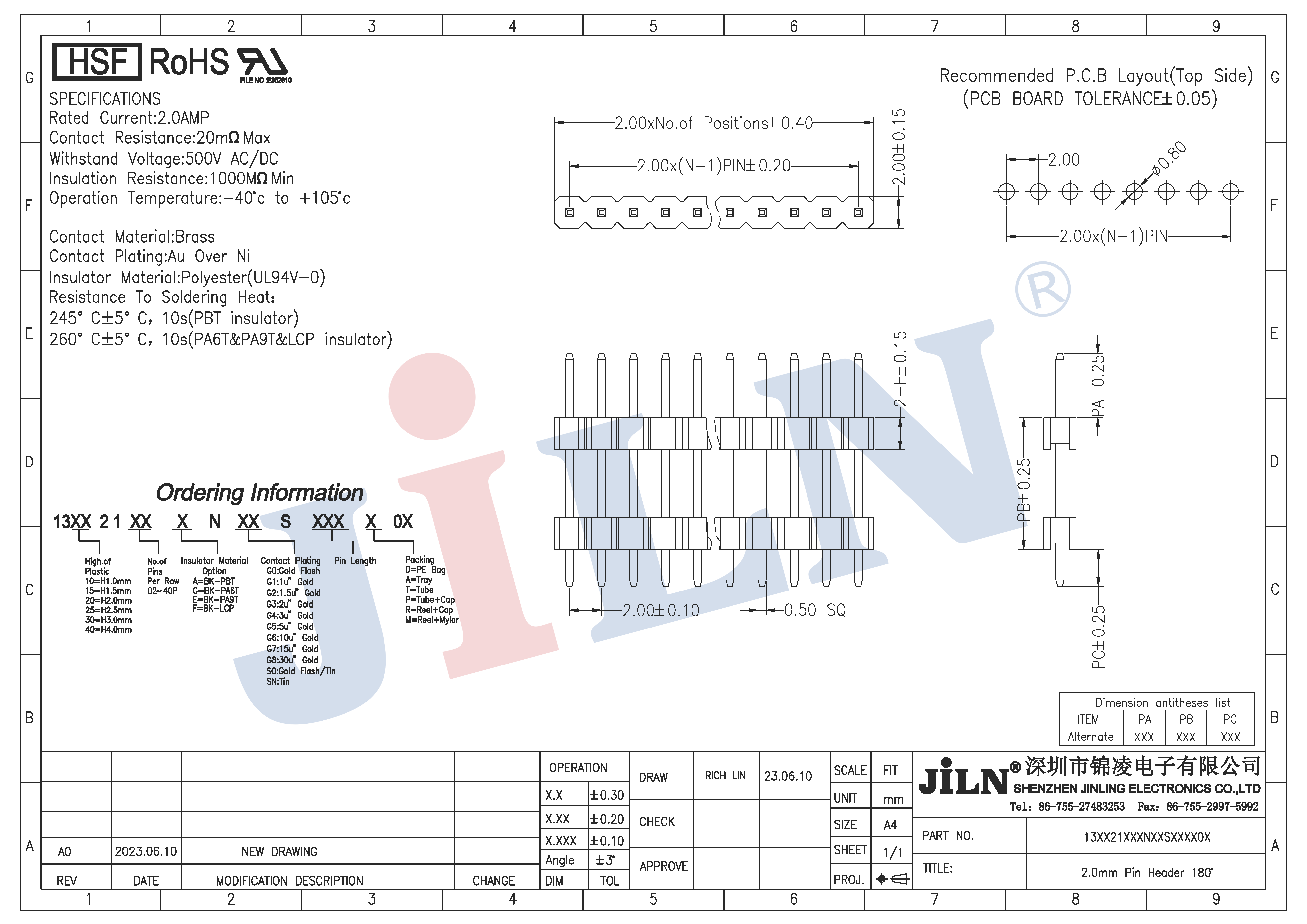 2.0mm排针/180°/单排/双塑/H1.0/H1.5/H2.0/H2.5/H3.0/H4.0