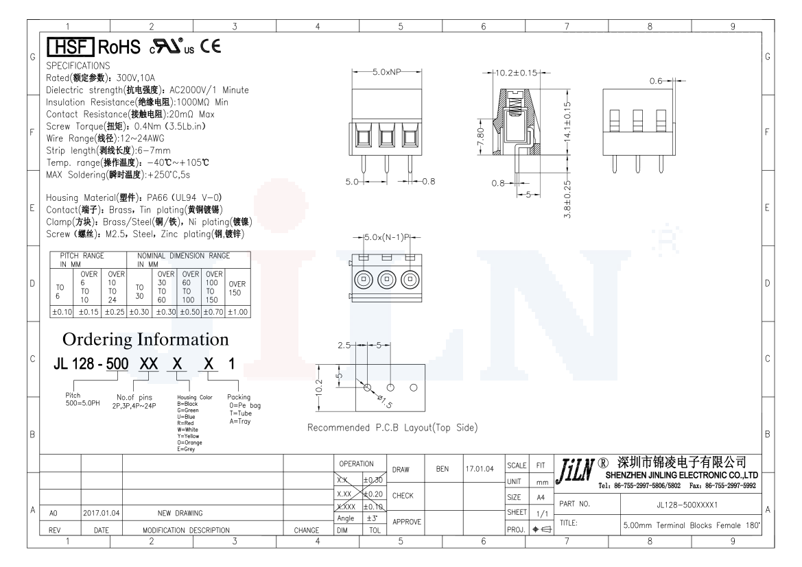 JL128-500XXXX1,5.00mm,通孔焊接,180°